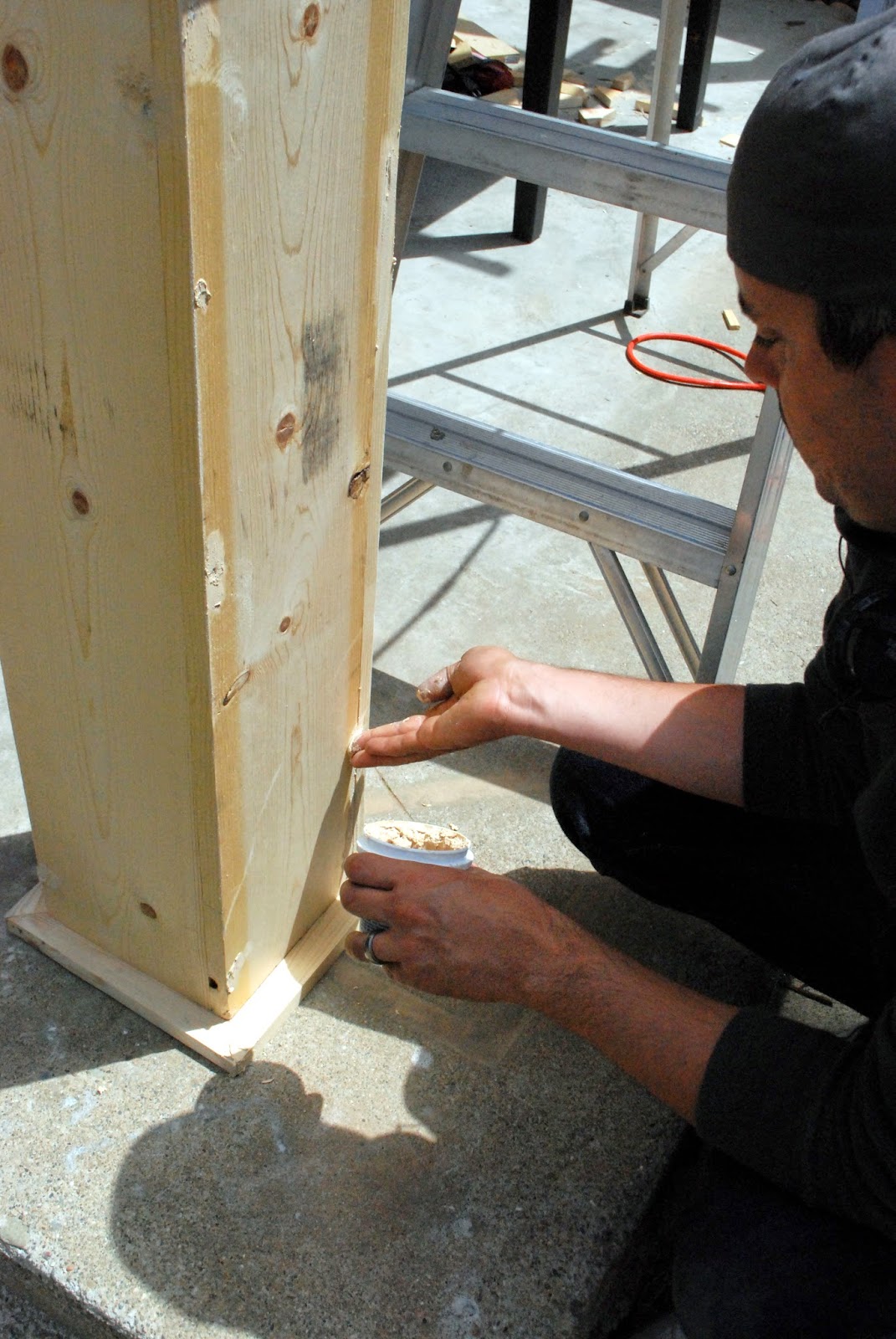 I totally forgot to take pictures of the next step, but we painted the majority of the pergola a dark, chocolate brown - "Barista" by Valspar (Lowe's) and it's an exterior satin finish. The creamy color is "Raffia Creme" by Behr (Home Depot) and is also an exterior satin.