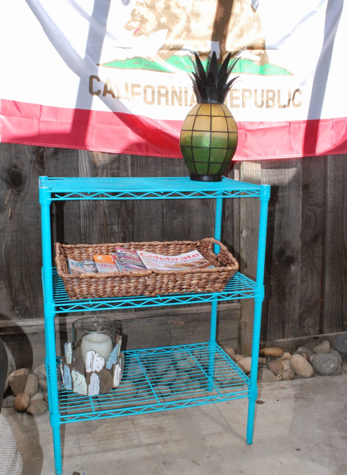 I spray painted a wire shelving unit turquoise, so that we'd have a bit more area to place plates or drinks. I've also got a basket filled with magazines, and some cute luminaries: