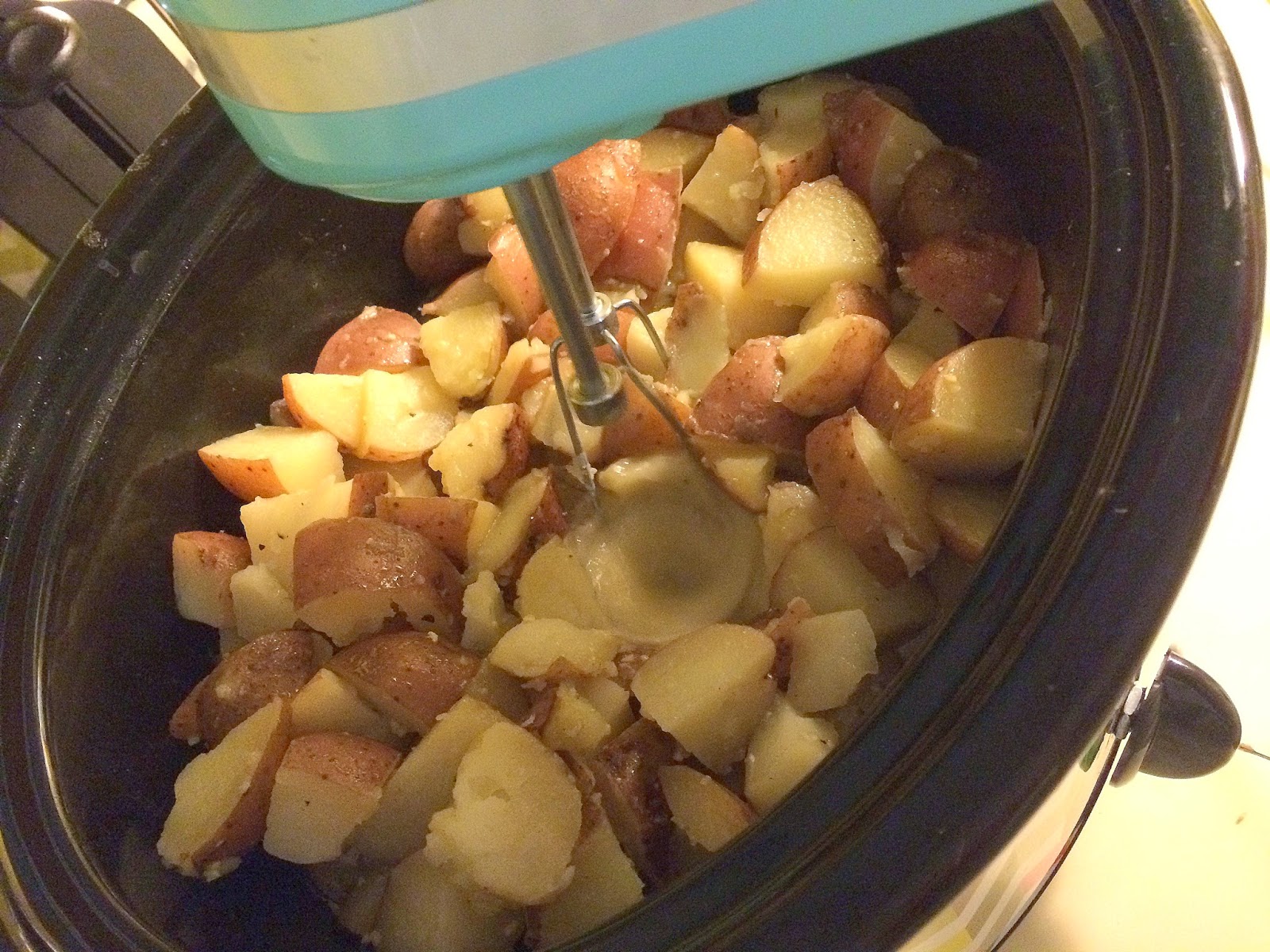 Step three. Blend everything up with a hand mixer, right there in the crock pot. I didn't go overboard, because I don't love my mashed potatoes super duper creamy. I left some good texture in there, but feel free to blend as much or as little as you want.