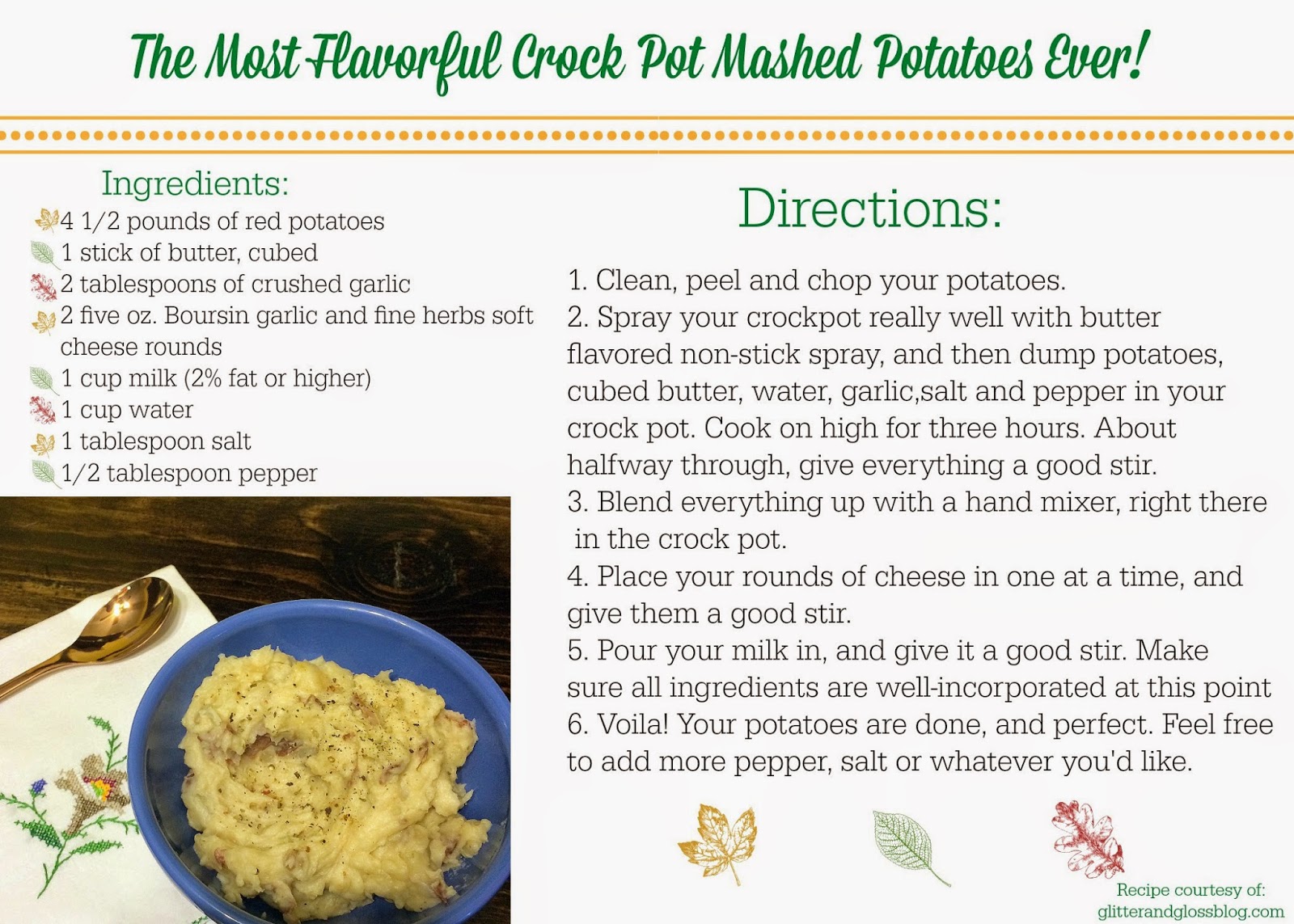 These potatoes are perfect for Thanksgiving because they make enough to feed a crowd, and with the addition of all that cheese and butter, they're a bit more decadent than the kind of mashed potatoes you might serve as a side dish with a random meal. It's also great making them in the crock pot, because you can keep them warm for hours, just by changing the setting to "warm" and putting what you want out immediately in a serving bowl. Crock pots are also super portable, and easy to take with you.