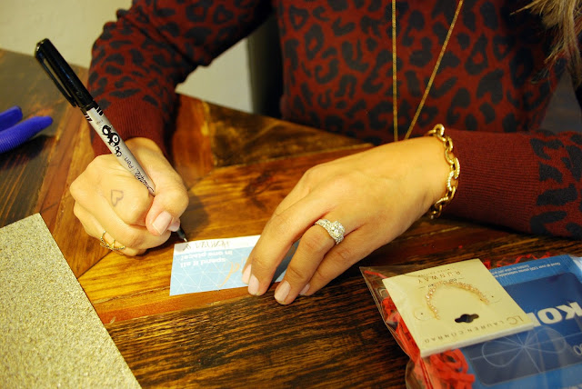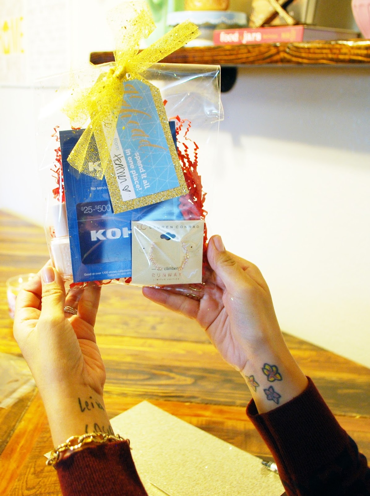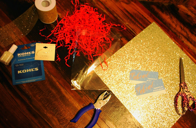 Now, the gift card is the star of the show, but I like to include one or two small items from the store that the gift card is for. In this case I grabbed some adorable earrings (I may or may not have bought a pair for myself too...) and a nail polish one of my favorite colors, Marshmallow. These little extras take your gift card gift to the next level.