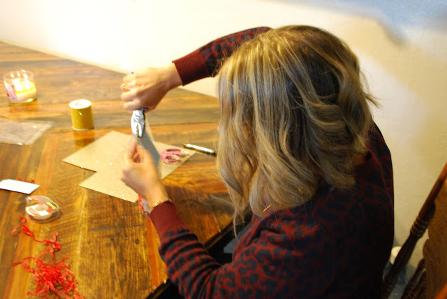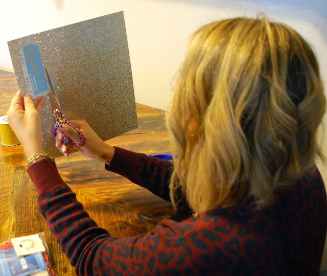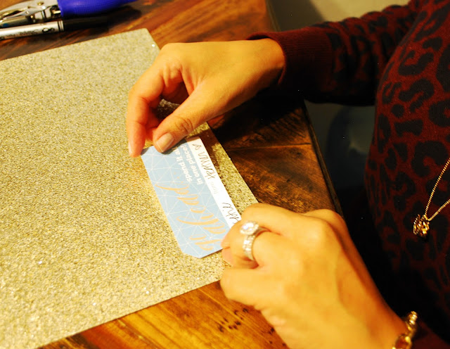 Cut around the glitter paper, leaving a little space between the glitter paper and your gift tag. We want to see the sparkle!
